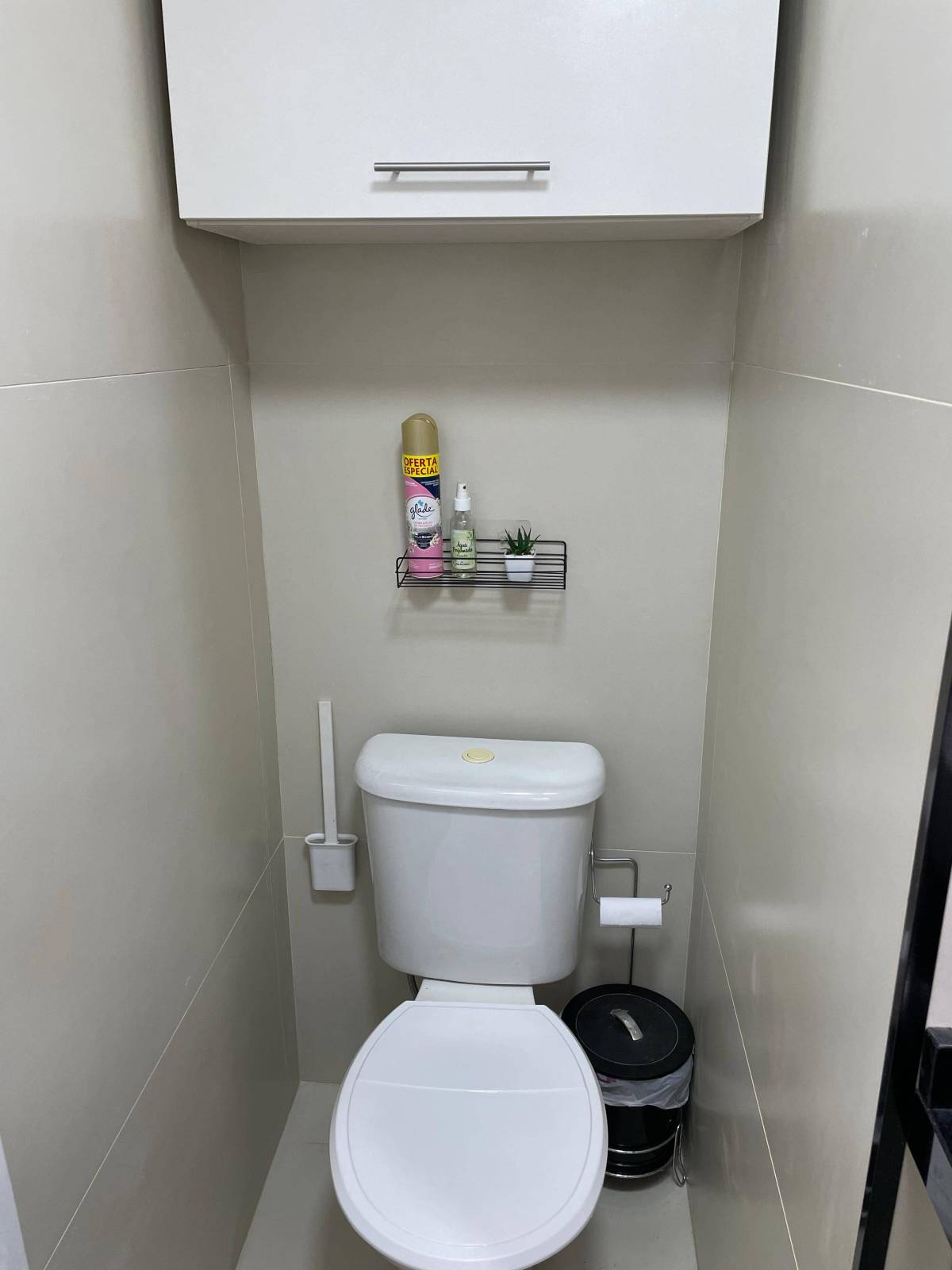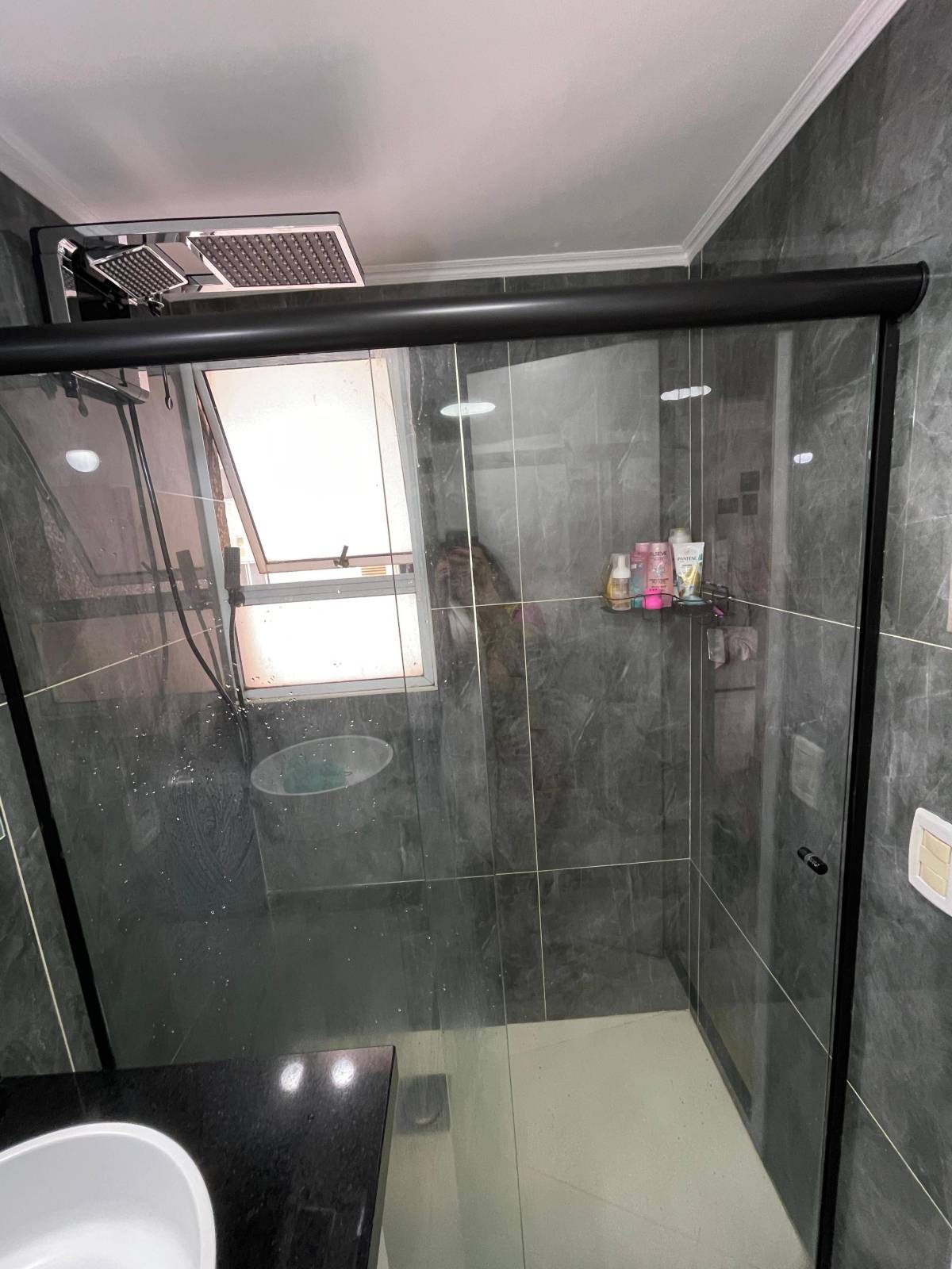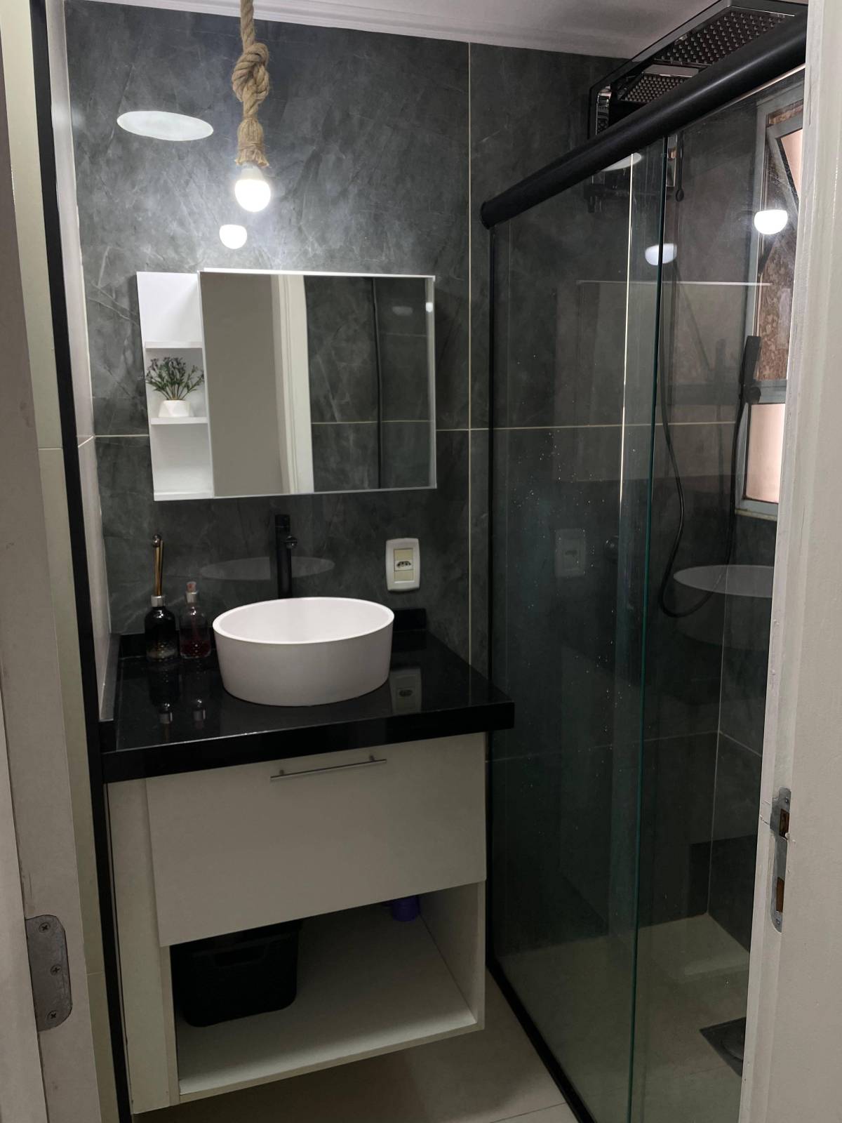 * Banheiro social com armários planejado e box blindex: