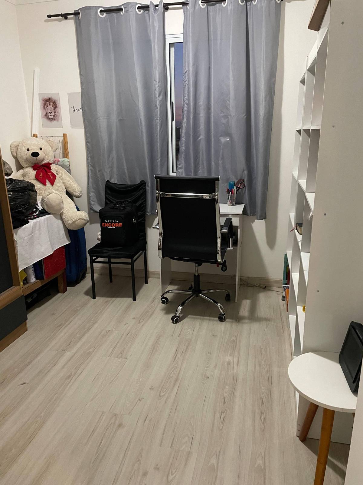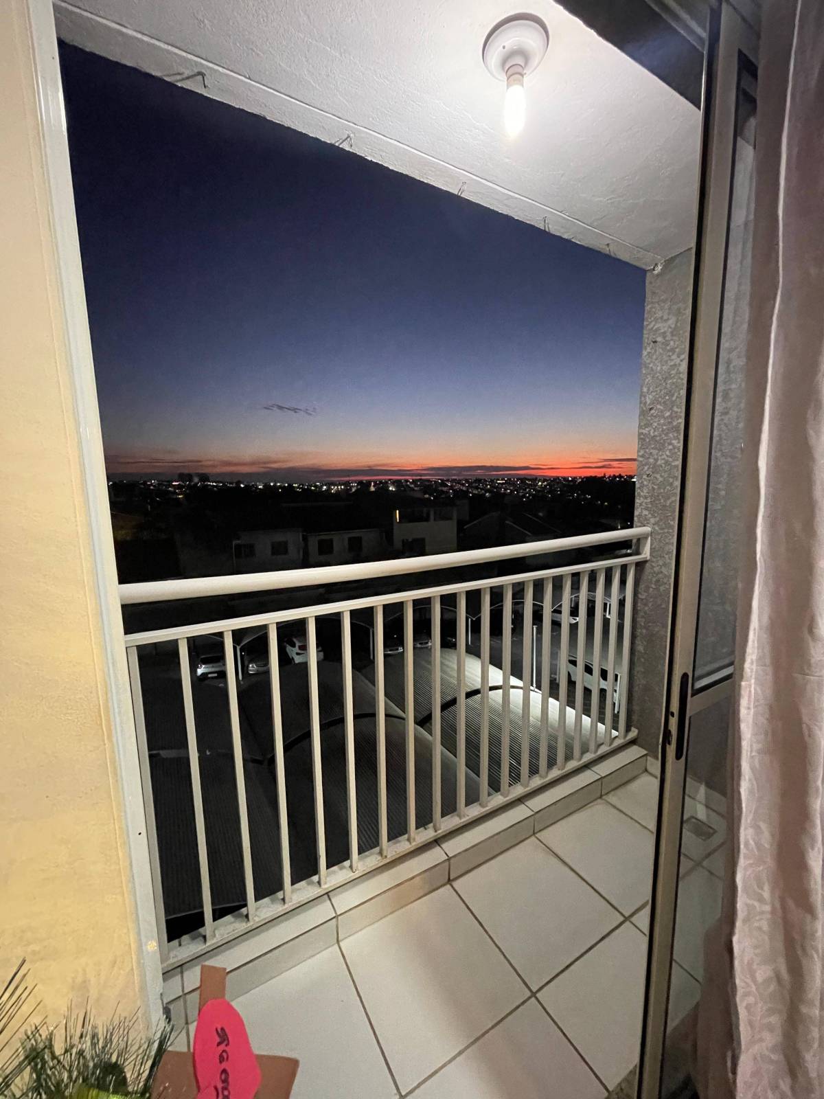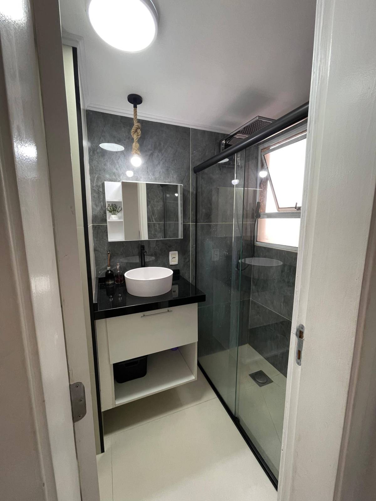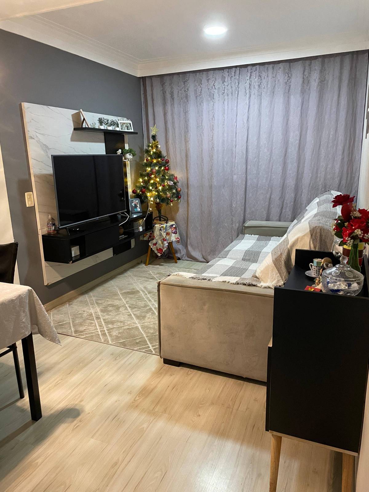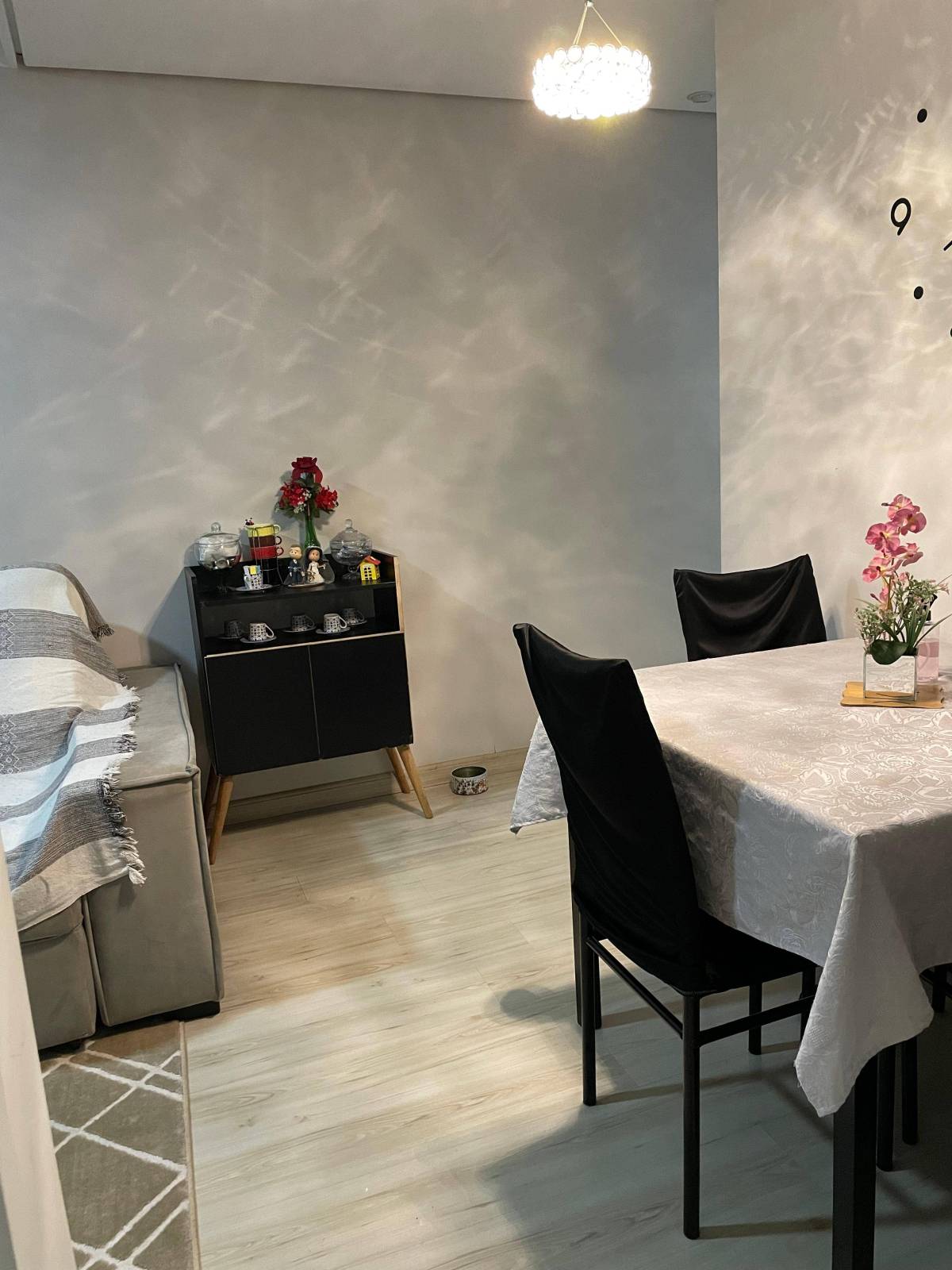 Apartamento com piso laminado, pendentes na sala e banheiro.