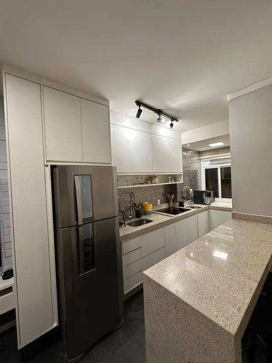 A cozinha possui todos os itens essenciais para o seu dia a dia, incluindo uma geladeira, um fogão de 04 bocas, com móveis planejados integrando juntamente com a lavanderia