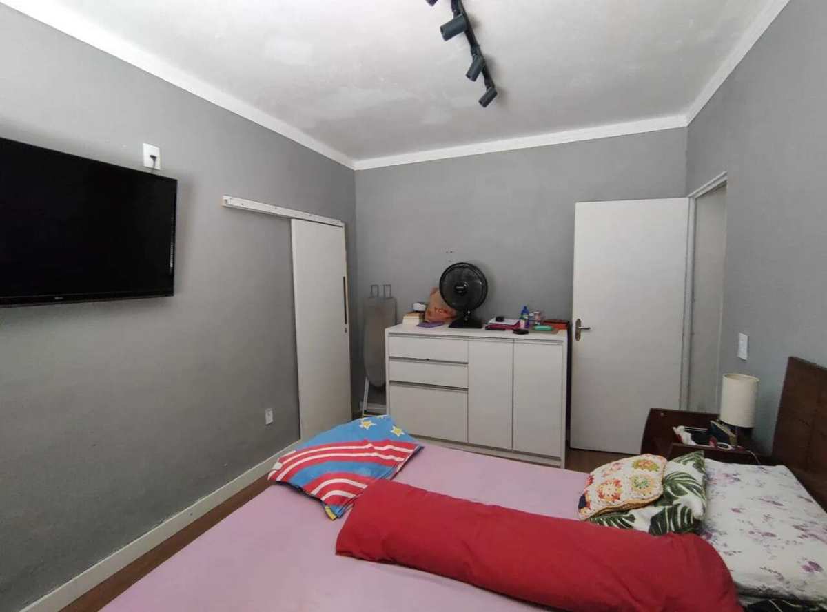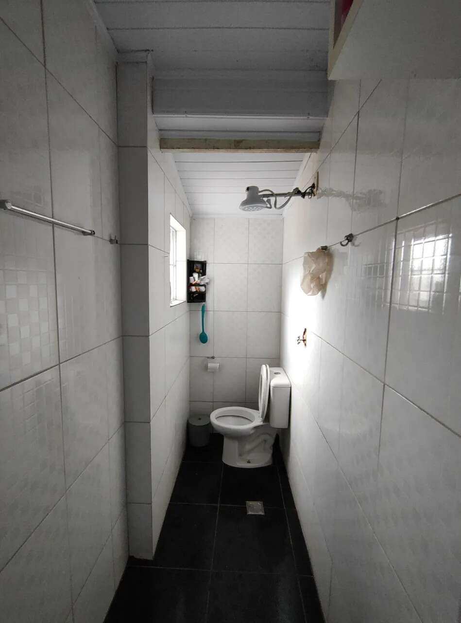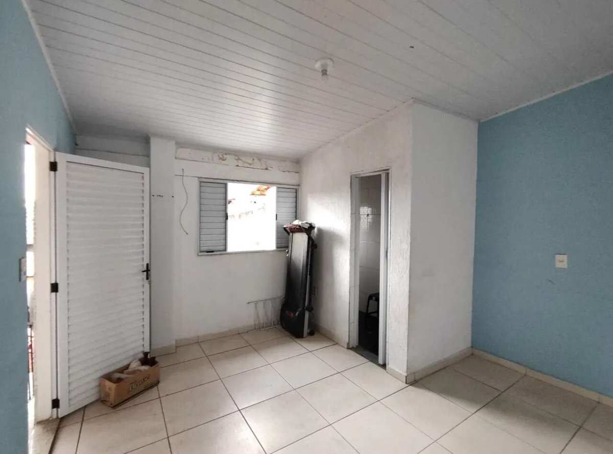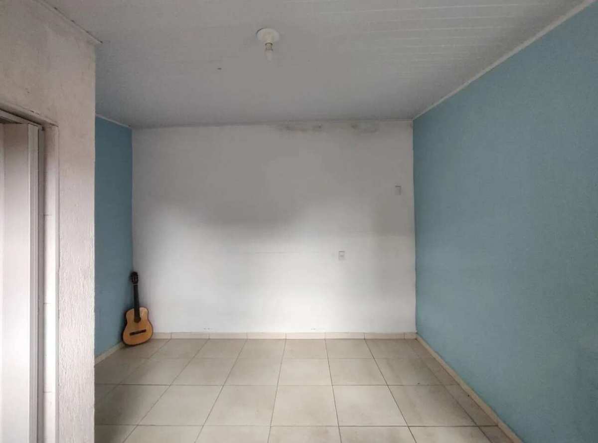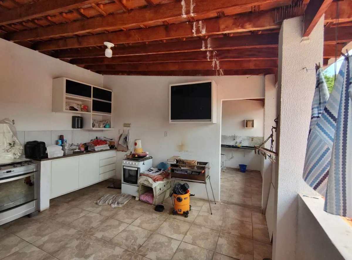 Parte superior um quarto com banheiro e cozinha conjugada com área de churrasco