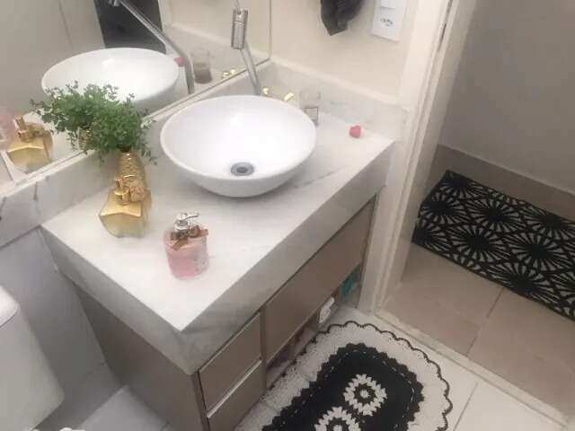 Banheiros com cuba sobreposta branca e mármore branco carrarinha e armários modulados.