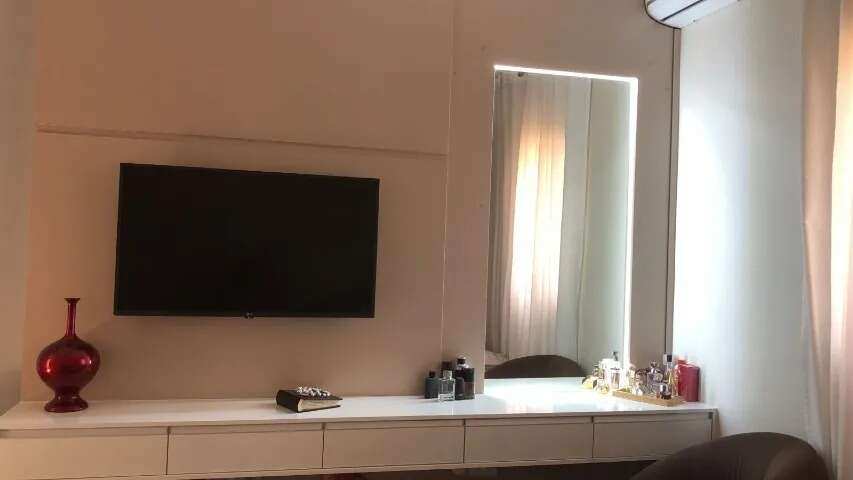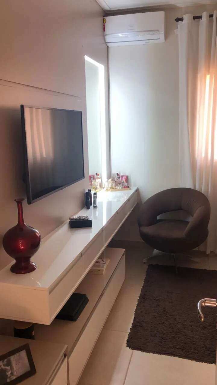 Suíte com painel laca e penteadeira com espaço para jóias e maquiagens.